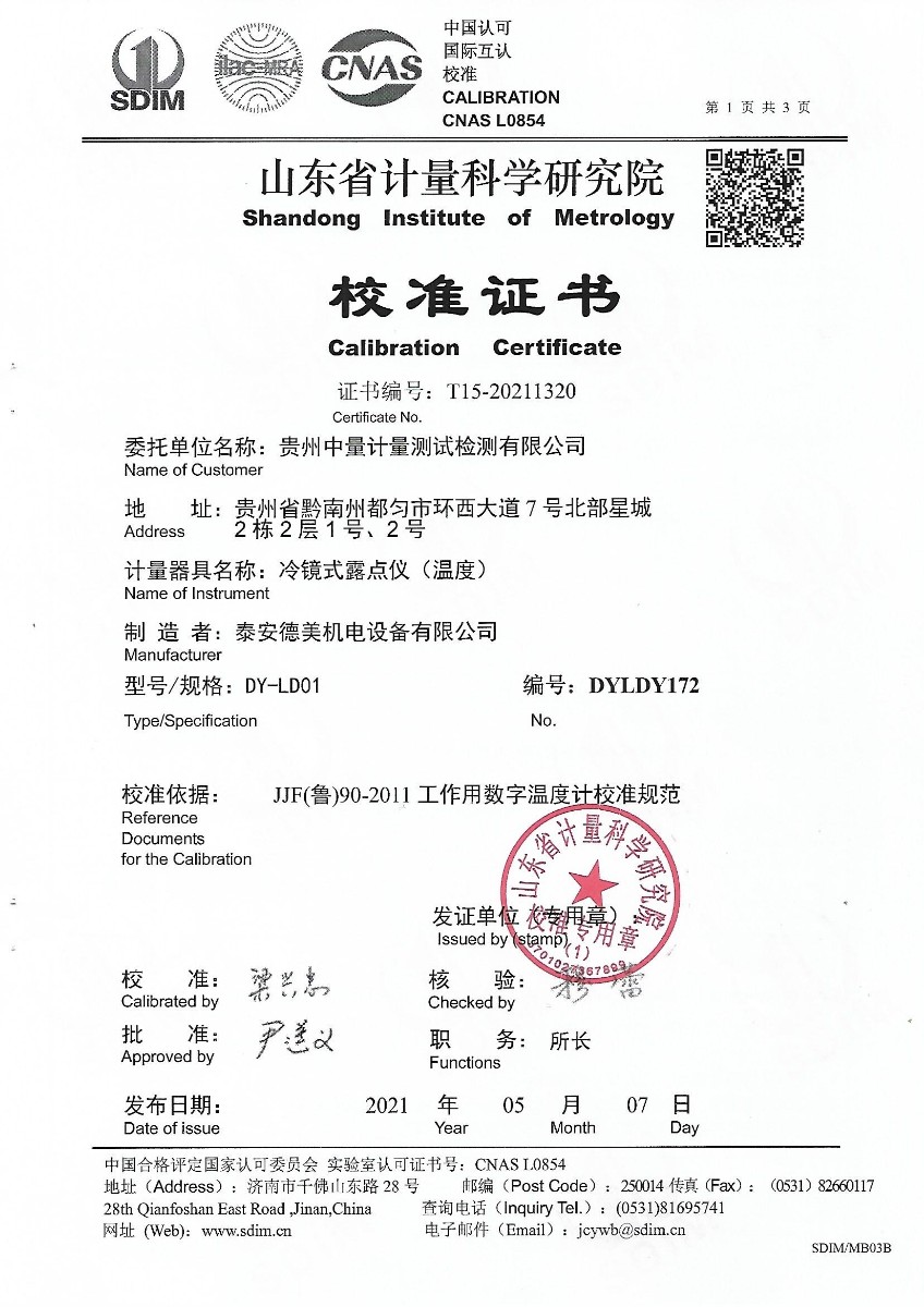 | 上一條:貴州中量計量測試檢測有限公司-冷鏡式露點儀檢定證書 | 下一條:冷鏡式露點儀校準(zhǔn)證書 |