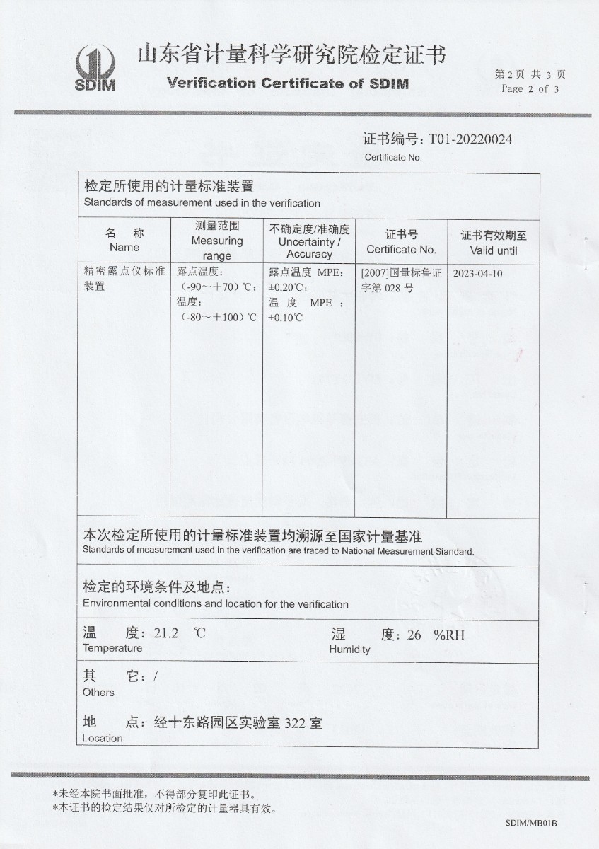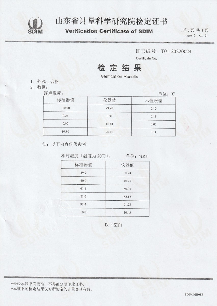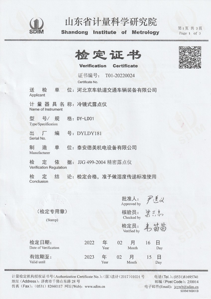 | 上一條:河北京車軌道交通車輛裝備有限公司-冷鏡式露點(diǎn)儀(溫度)校準(zhǔn)證書 | 下一條:冷鏡式露點(diǎn)儀校準(zhǔn)證書 |